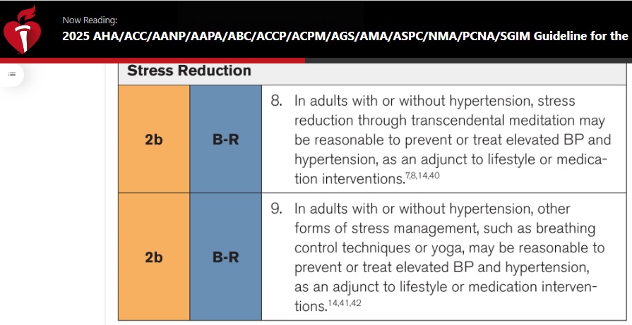 Объединенный комитет по обзору пришел к выводу, что трансцендентальная медитация имеет самые сильные и последовательные научные доказательства среди методов снижения стресса при гипертонии. Это официальное национальное руководство для медицинских работников. Национальные клинические рекомендации рекомендуют трансцендентальную медитацию как научно обоснованную модификацию образа жизни для снижения артериального давления и предотвращения сердечно-сосудистых осложнений и смертности. [a href="https://www.ahajournals.org/doi/10.1161/CIR.0000000000001356" target="_blank">